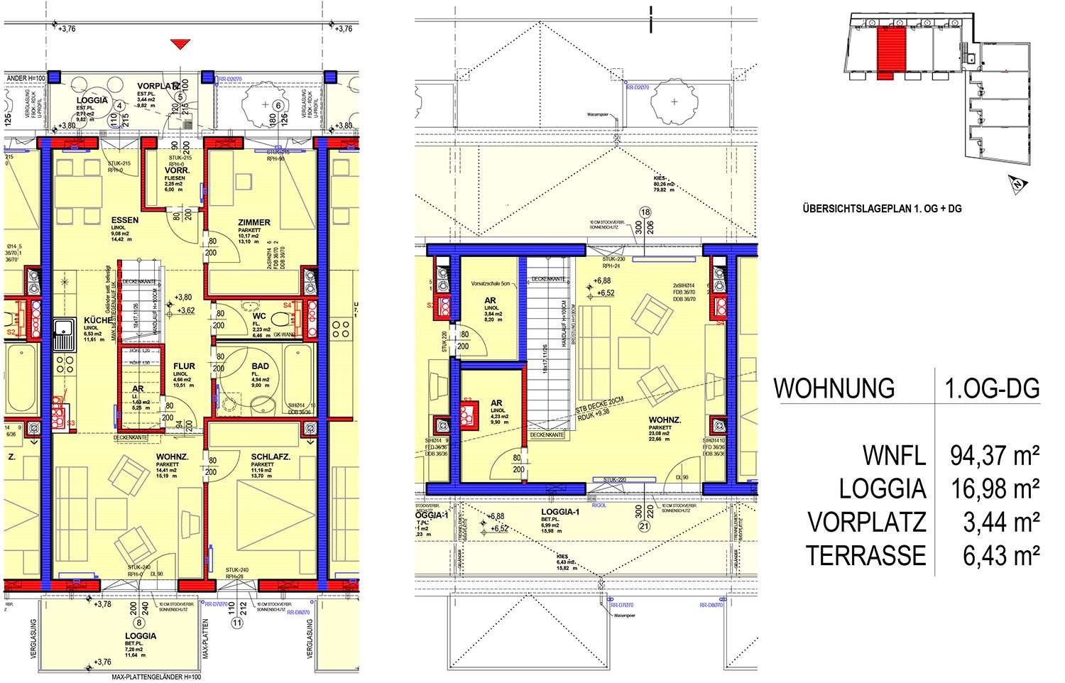 im 1. Obergeschoss mit 111,35 m², vier Zimmer, Bad/WC getrennt, VR, AR, Parkett, Loggia, Terrasse, HWB = 29 kWh/m²a, Lift, TG-Parkplatz