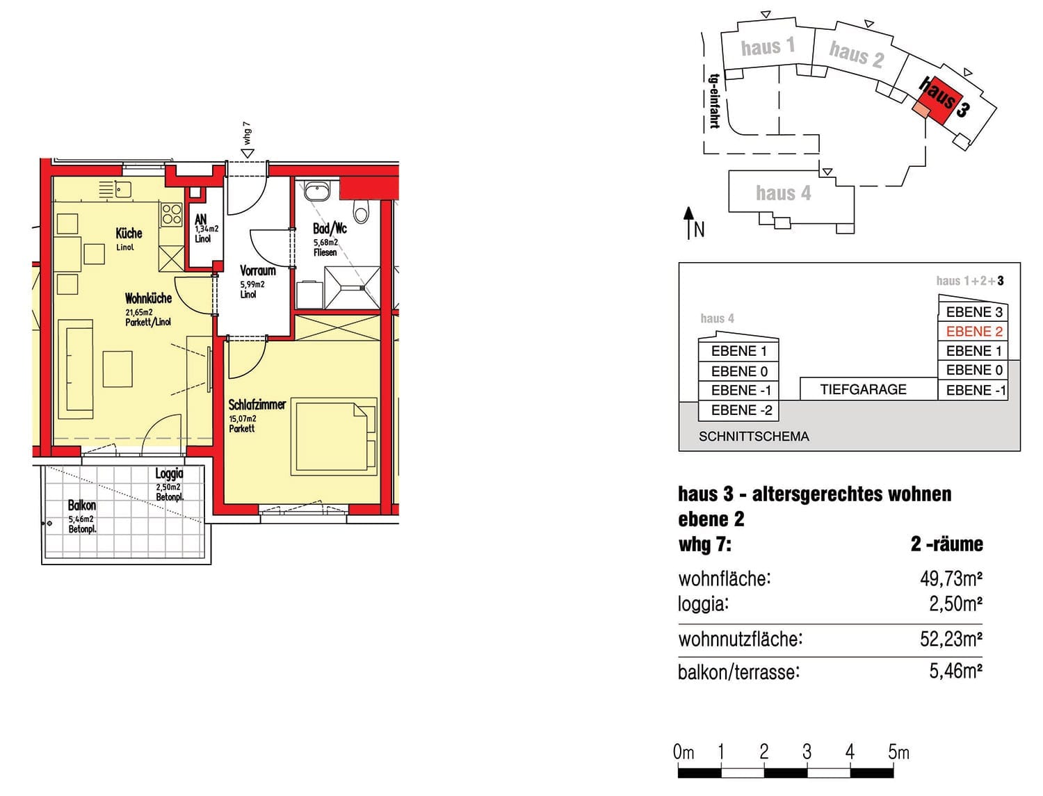 im 1. Obergeschoss mit 52,23 m², zwei Zimmer, Bad/WC, VR, Loggia, Parkett, HWB = 43 kWh/m²a, Lift