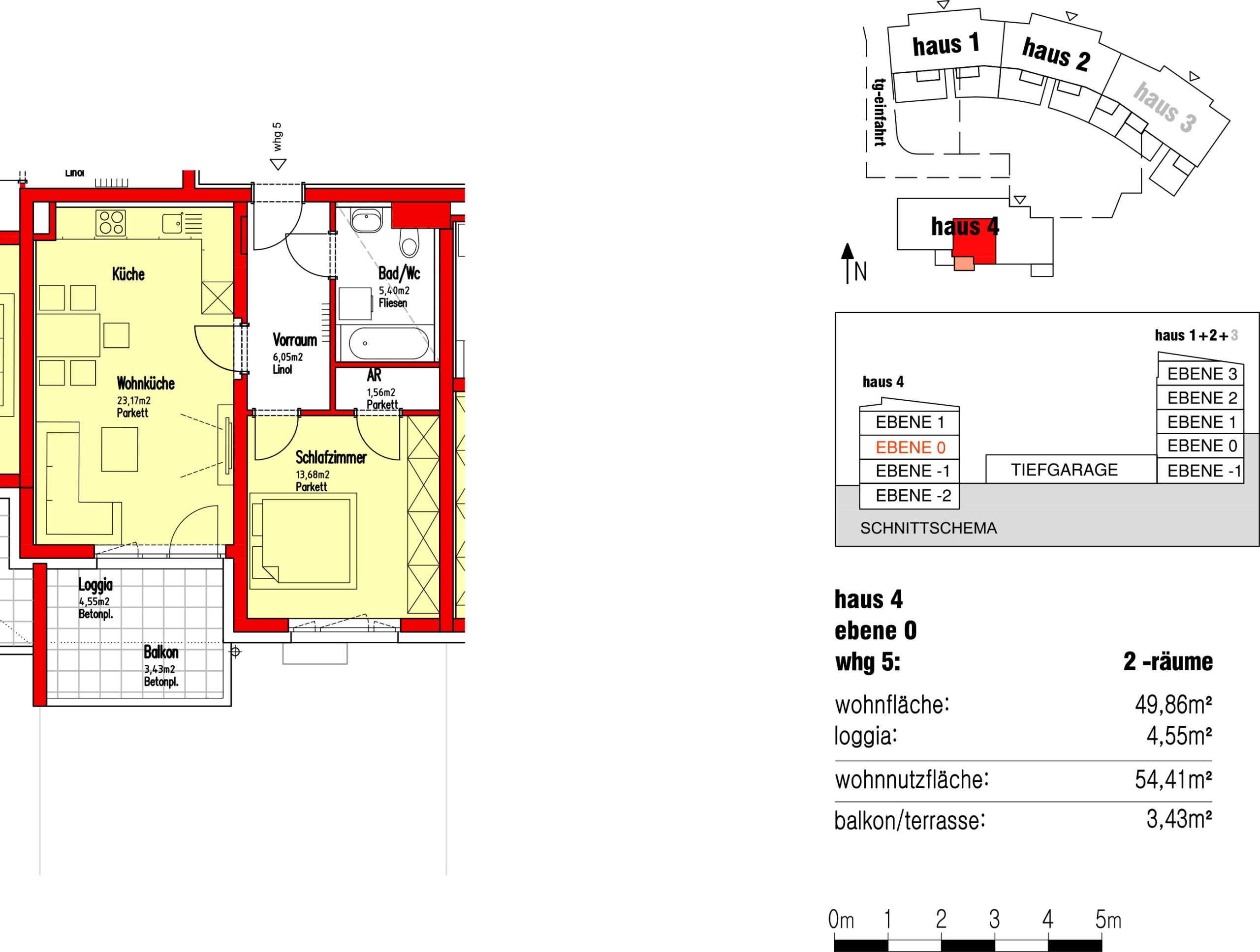 im 1. Obergeschoss mit 54,41 m², zwei Zimmer, Bad/WC, VR, AR, Parkett, Loggia, HWB = 17,5 kWh/m²a, TG-Parkplatz, Lift