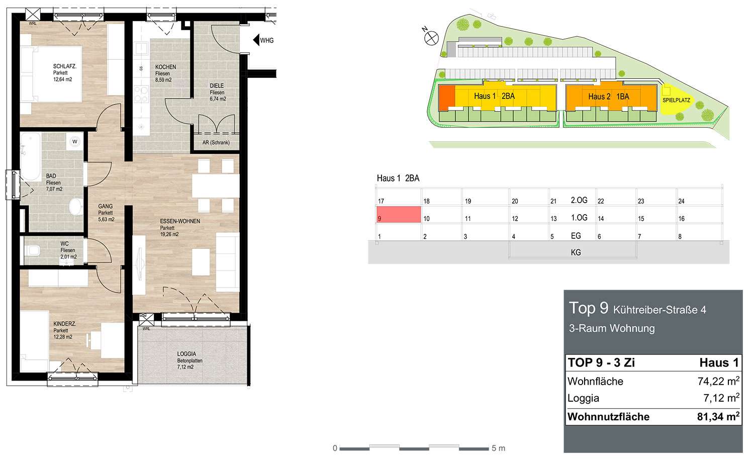 im 1. Obergeschoss mit 81,34 m², drei Zimmer, Bad/WC getrennt, VR, AR, Loggia, Parkett, HWB = 35 kWh/m²a, Parkplatz, Lift