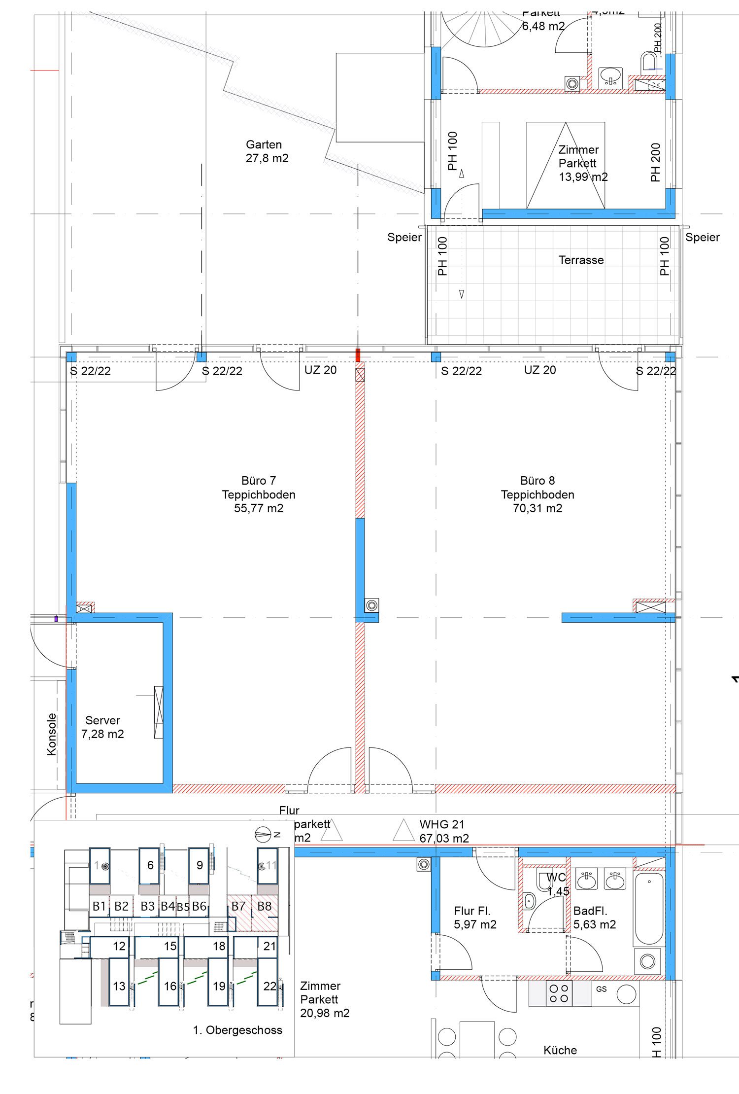 im 1. Obergeschoss mit 55,77 m², ein Büroraum, Bad/WC, HWB = 19,1 kWh/m²a, Parkplatz