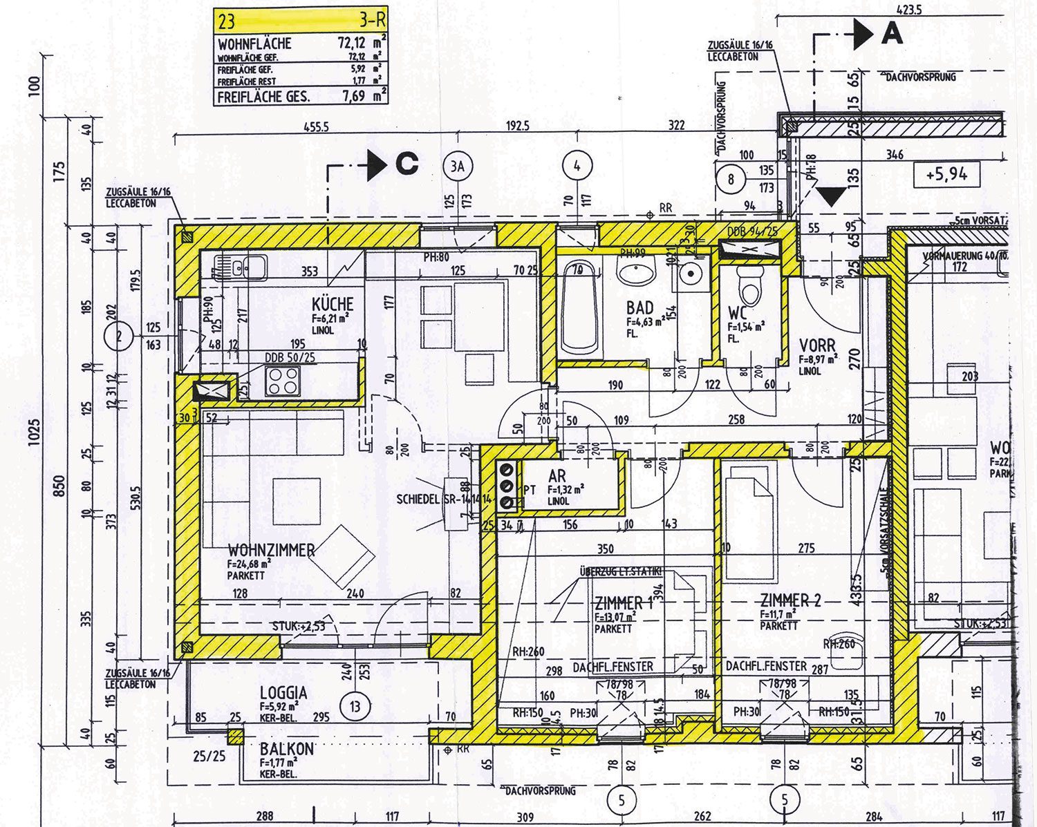 im Dachgeschoss mit 78,04 m², drei Zimmer, Bad/WC getrennt, VR, AR, Loggia, Parkett, HWB = 80,2 kWh/m²a, Lift, TG-Parkplatz