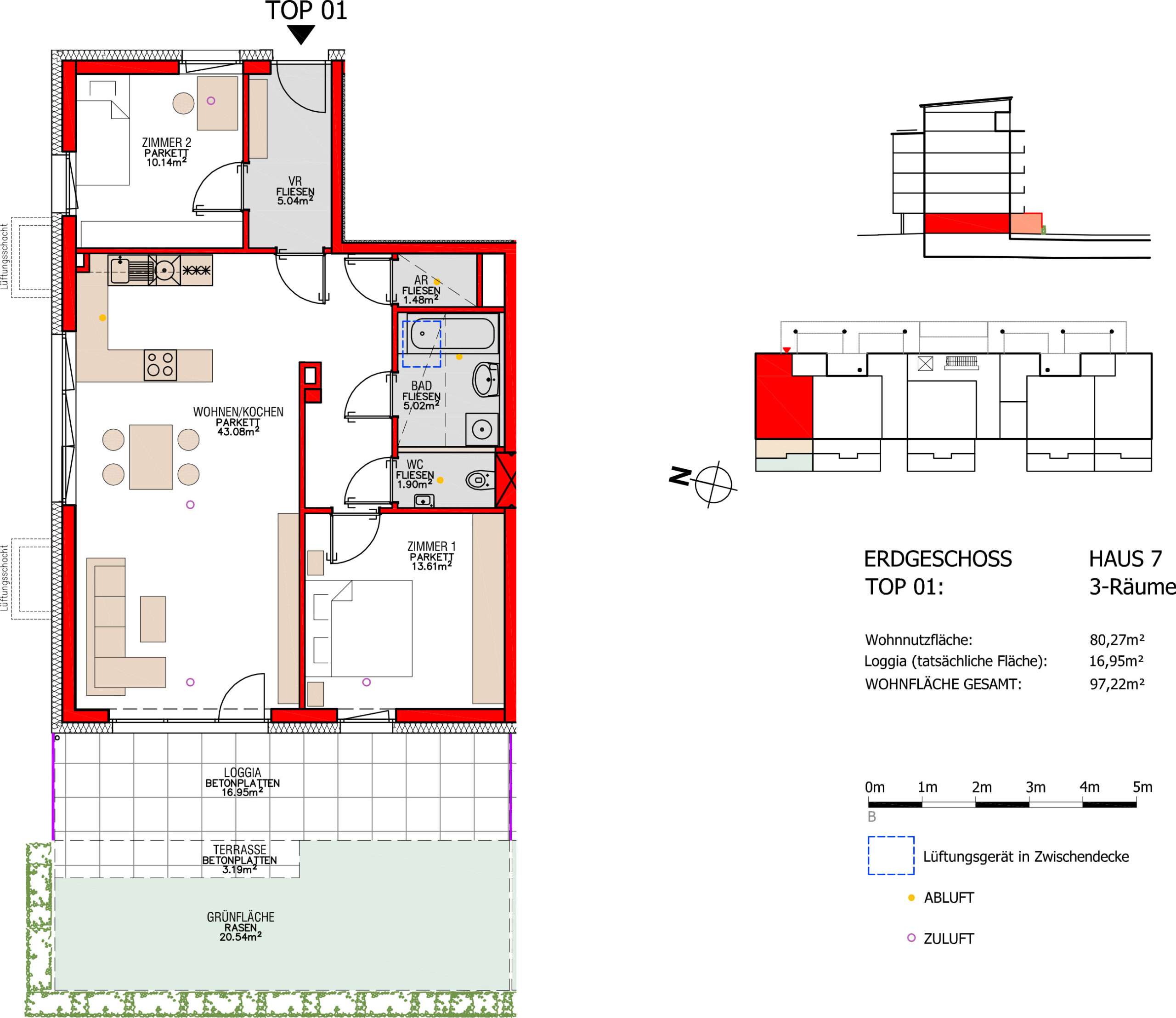 im Erdgeschoss mit 97,27 m², drei Zimmer, Bad/WC getrennt, VR, AR, Parkett, Terrasse, Garten, HWB = 15,3 kWh/m²a, TG-Parkplatz, Lift