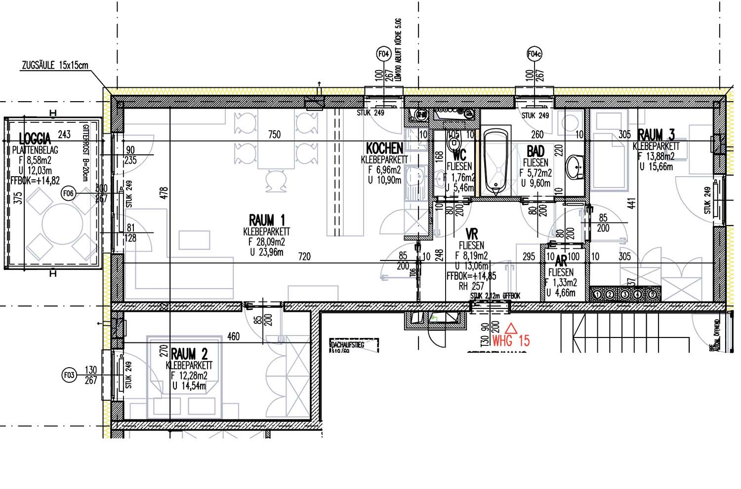 im 4. Obergeschoss mit 86,93 m², drei Zimmer, Bad/WC getrennt, VR, AR, großzügige Loggia, Parkett, HWB = 17 kWh/m²a, TG-Parkplatz, Lift