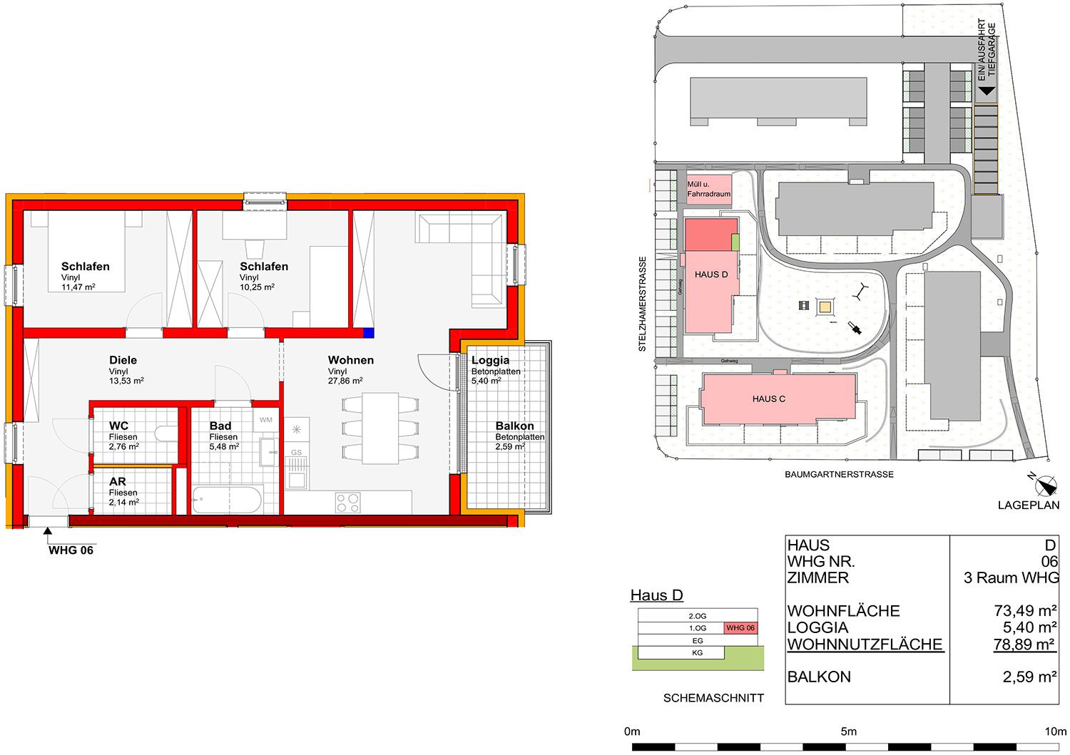 im 1. Obergeschoss mit 78,89 m², drei Zimmer, Bad/WC getrennt, VR, AR, Loggia, HWB = 38 kWh/m²a, Lift, Parkplatz