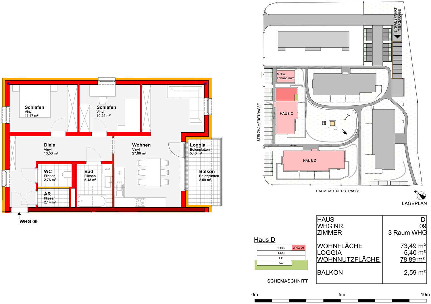 im 1. Obergeschoss mit 78,89 m², drei Zimmer, großzügige Diele, Bad/WC getrennt, VR, AR, Loggia, HWB = 38 kWh/m²a, Lift, Parkplatz