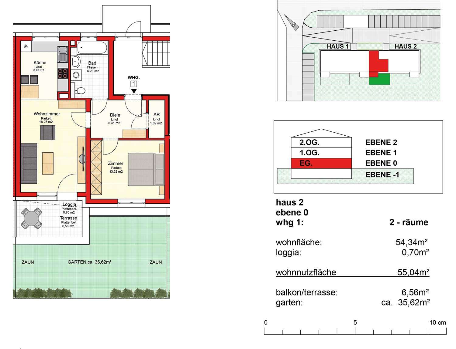 im Erdgeschoss mit 55,04 m², zwei Zimmer, Bad/WC getrennt, VR, AR, Loggia, Parkett, HWB = 31 kWh/m²a, Lift, Parkplatz