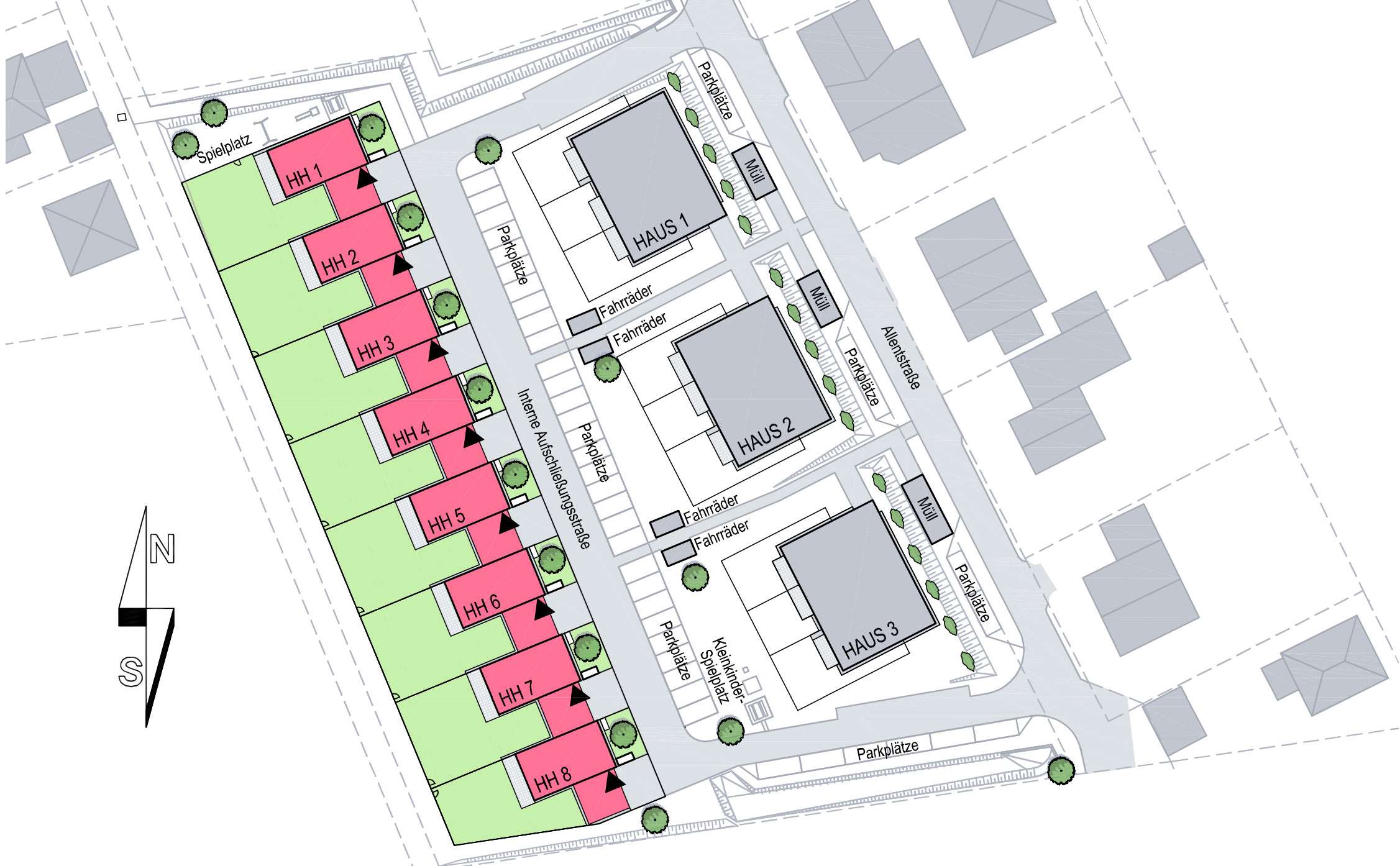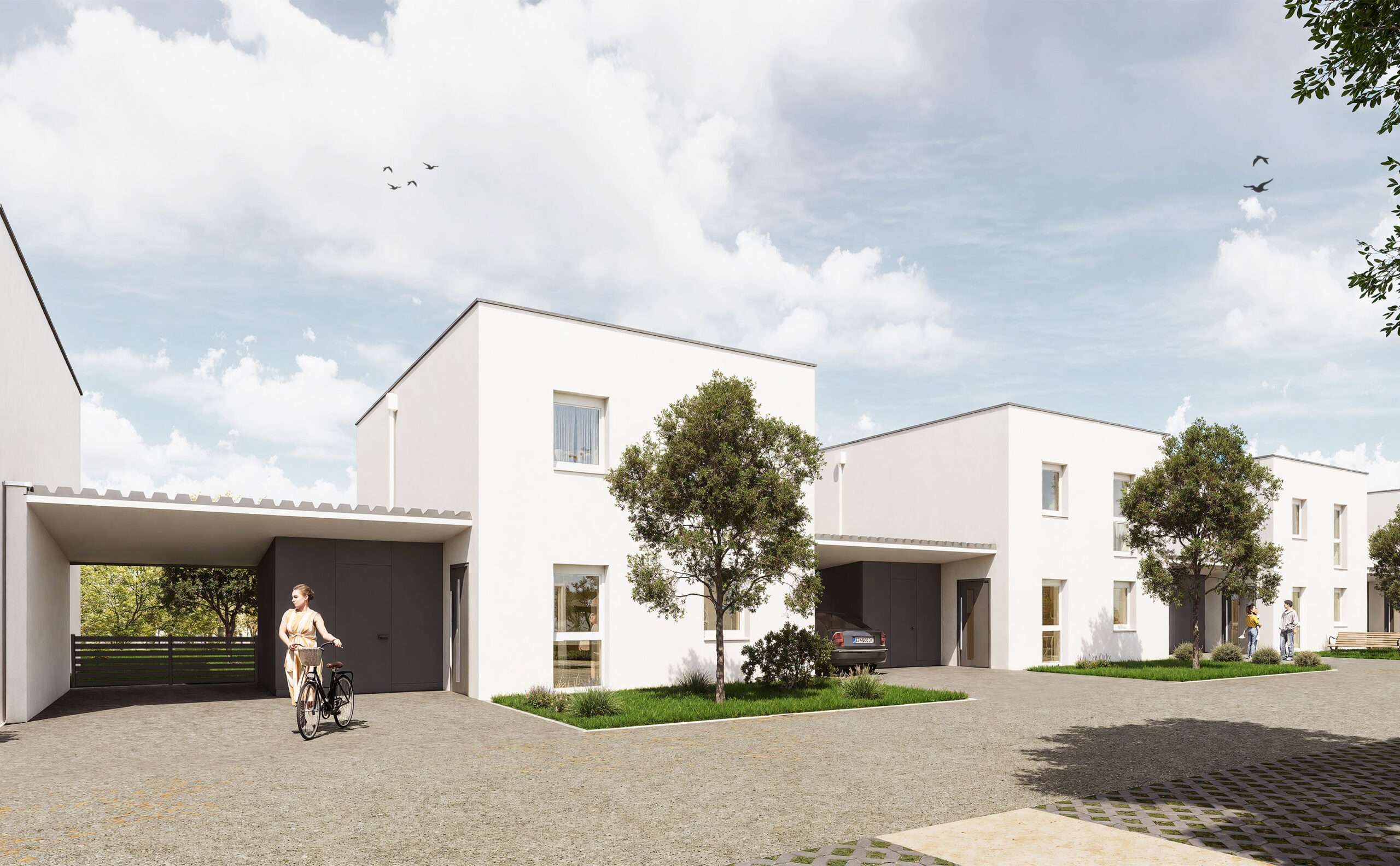 Es entstehen acht modern gestaltete Hofhäuser mit Carport und Parkplätzen.